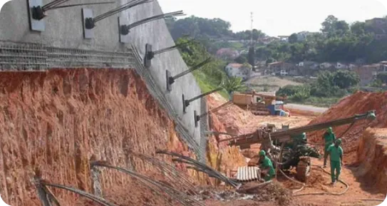 Cabos tensionados que sustentam muros e taludes. Aplicados com força controlada para evitar desmoronamentos ou escorregamentos.